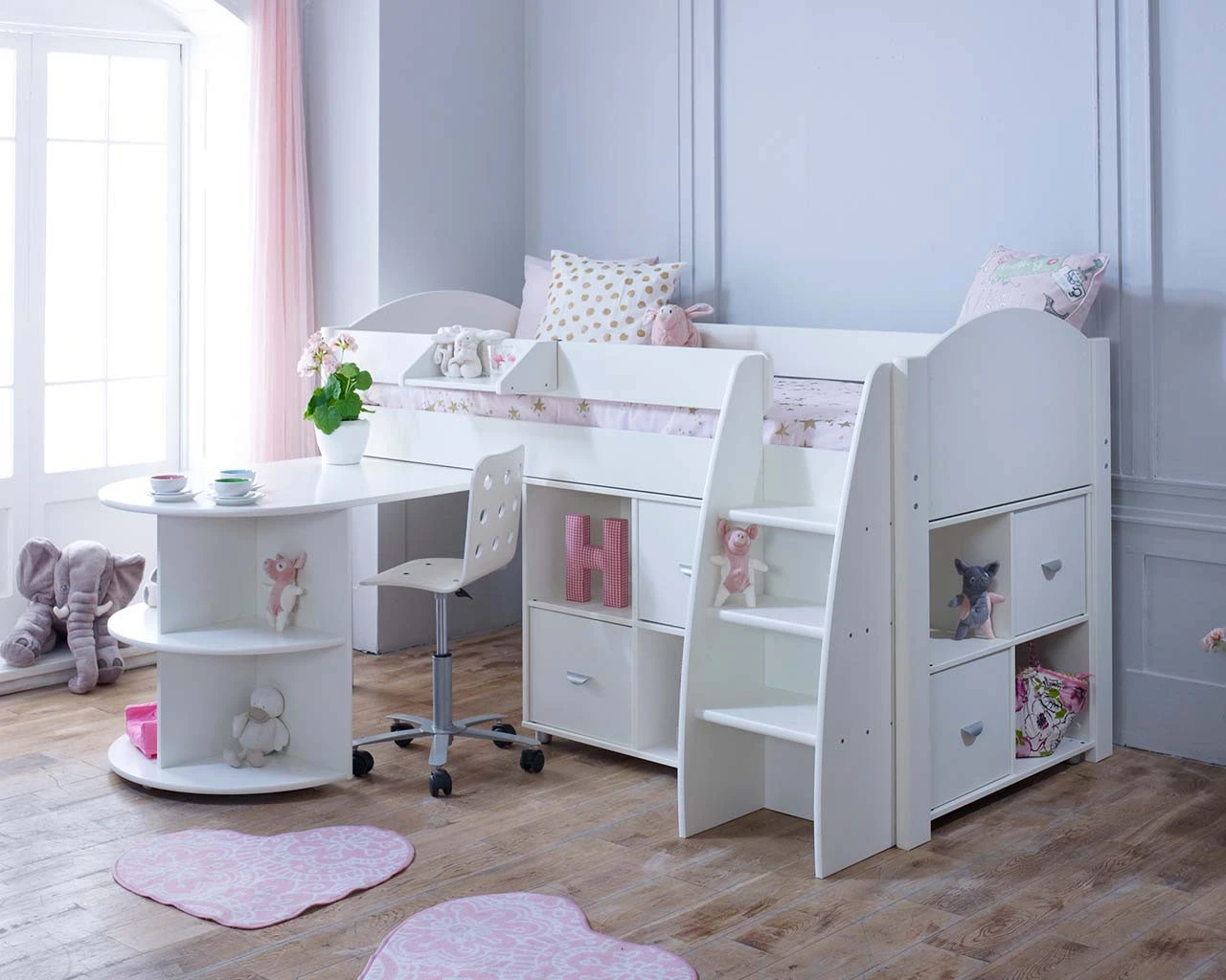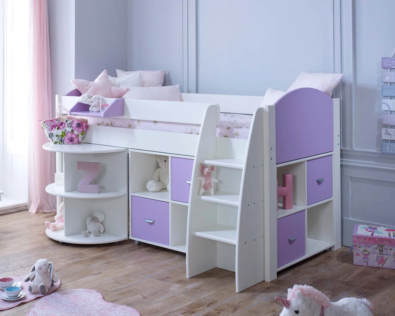Create a wonderfully stylish bedroom with this handy space saving cabin bed. The Noah & Eli G mid sleeper features a handy extendable desk and two storage cubes, each with two doors. The bed is also designed with easy to climb steps and a choice of colourful end panels, either lilac, white or blue, to brighten up your space.