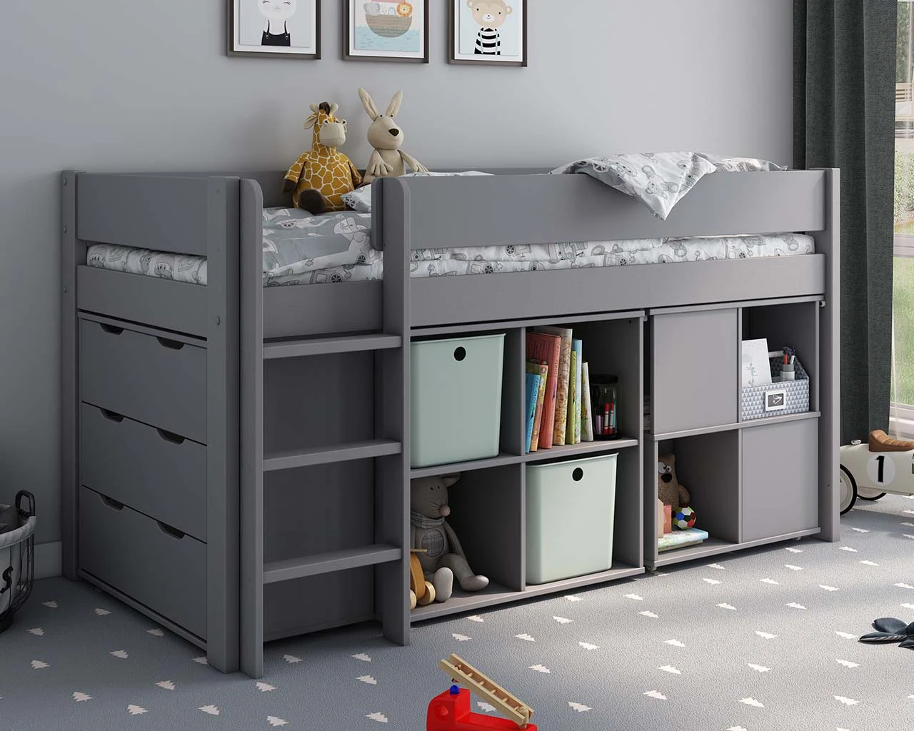 This Estella Midsleeper with Chest, Cube storage and pull out desk offers oodles of storage options all built below a 90×190 bed frame, with a secret hidden pull out desk which glides out with ease on castors to provide an area for them to sit up and study, game, play or simply get creative with arts and crafts. With easy to open cut out handles the chest drawers are deep for generous storage and the cube unit also provides cute cubby holes for displaying their favourite possessions.