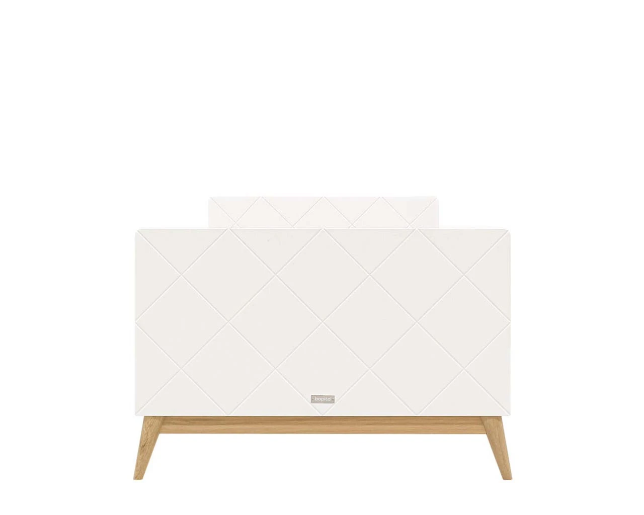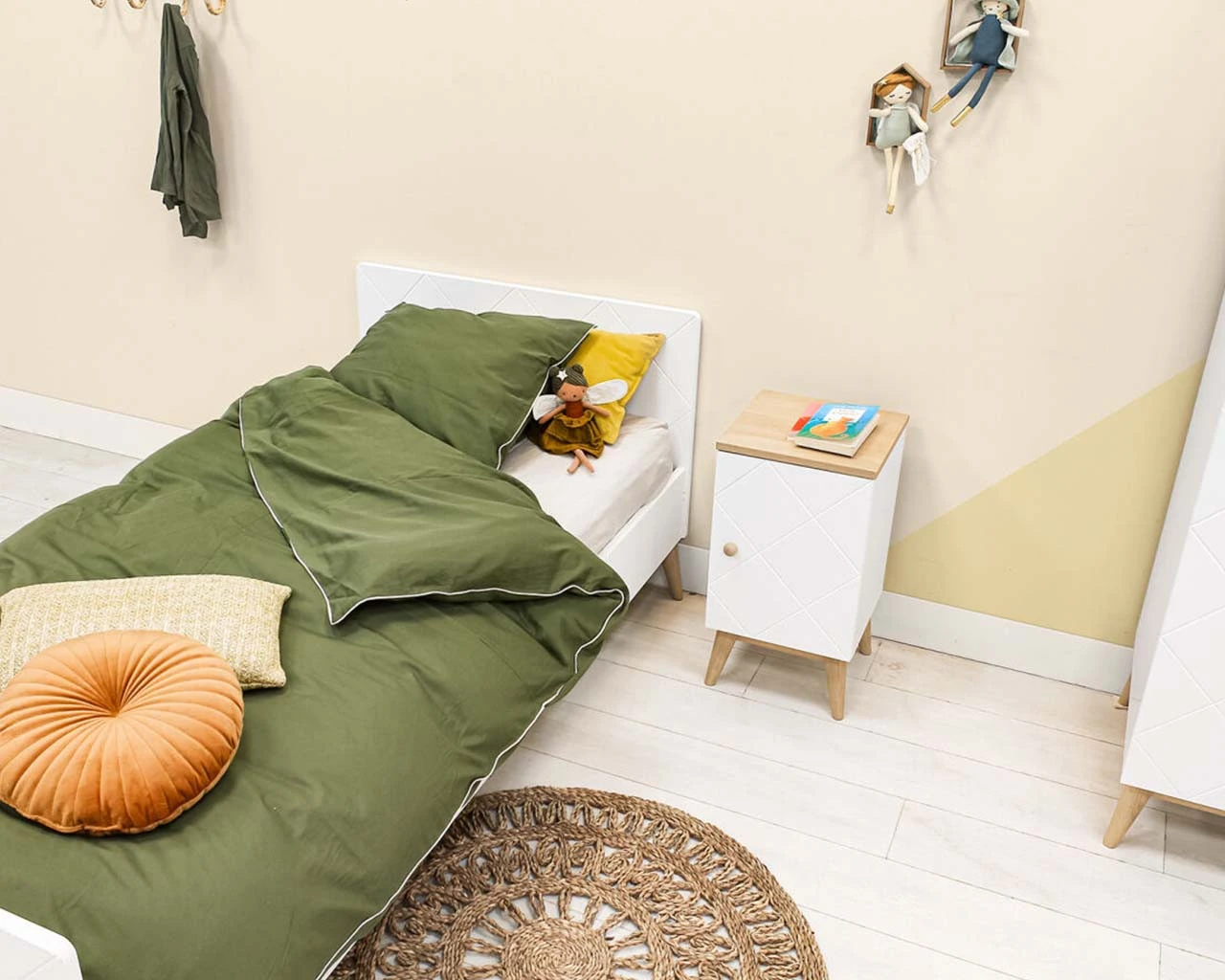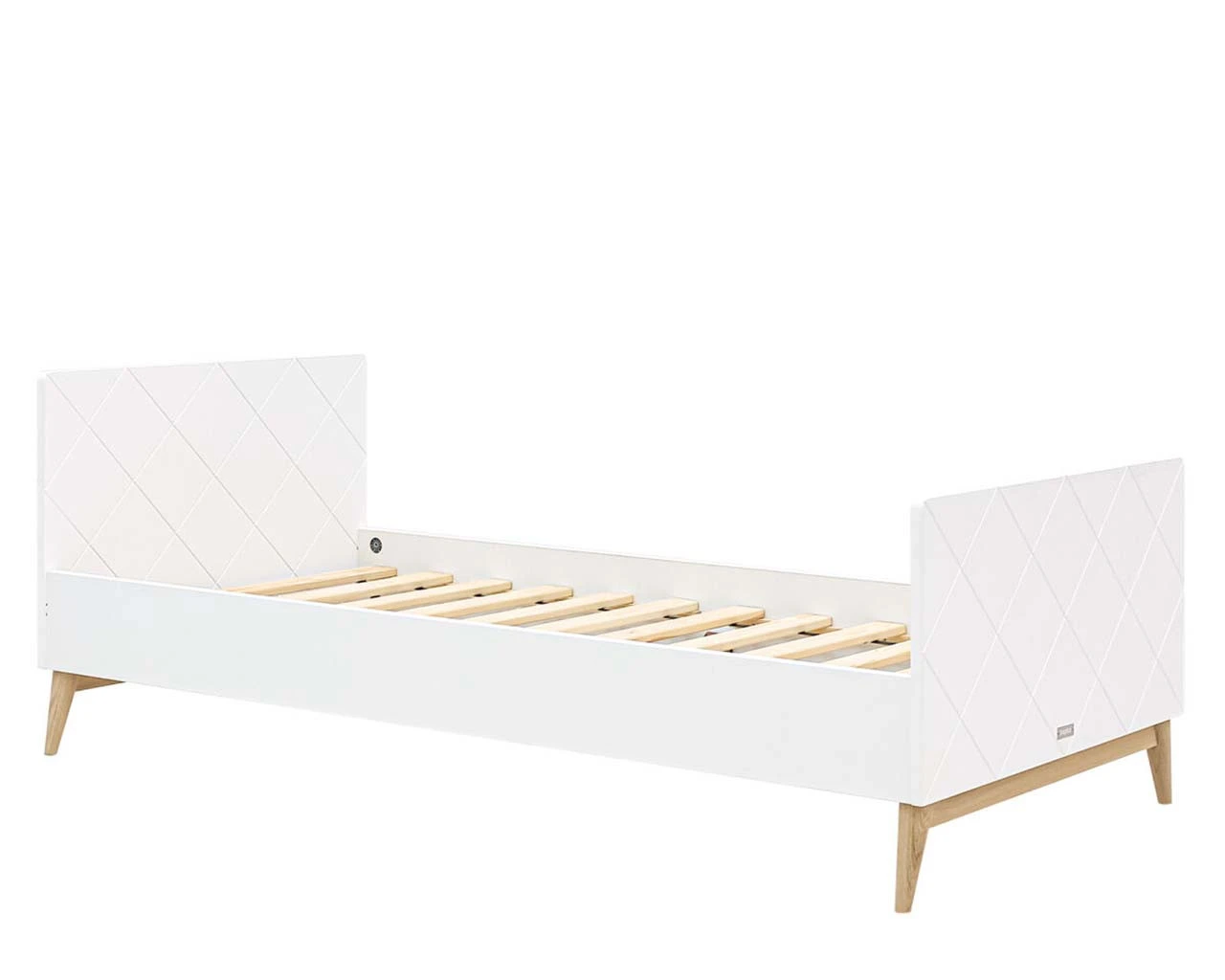 Our Evi single bed is sophisticated and contemporary in style with a combination of natural wood and a white painted finish. The rounded tapered legs give a soft and refined finish, made from solid Oak which are solid and sturdy. The headboard and footboard is finished with diagonal groves across the crisp white painted panels offering a touch of elegance.
