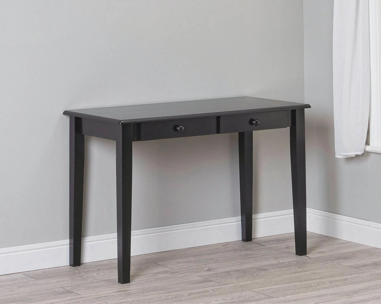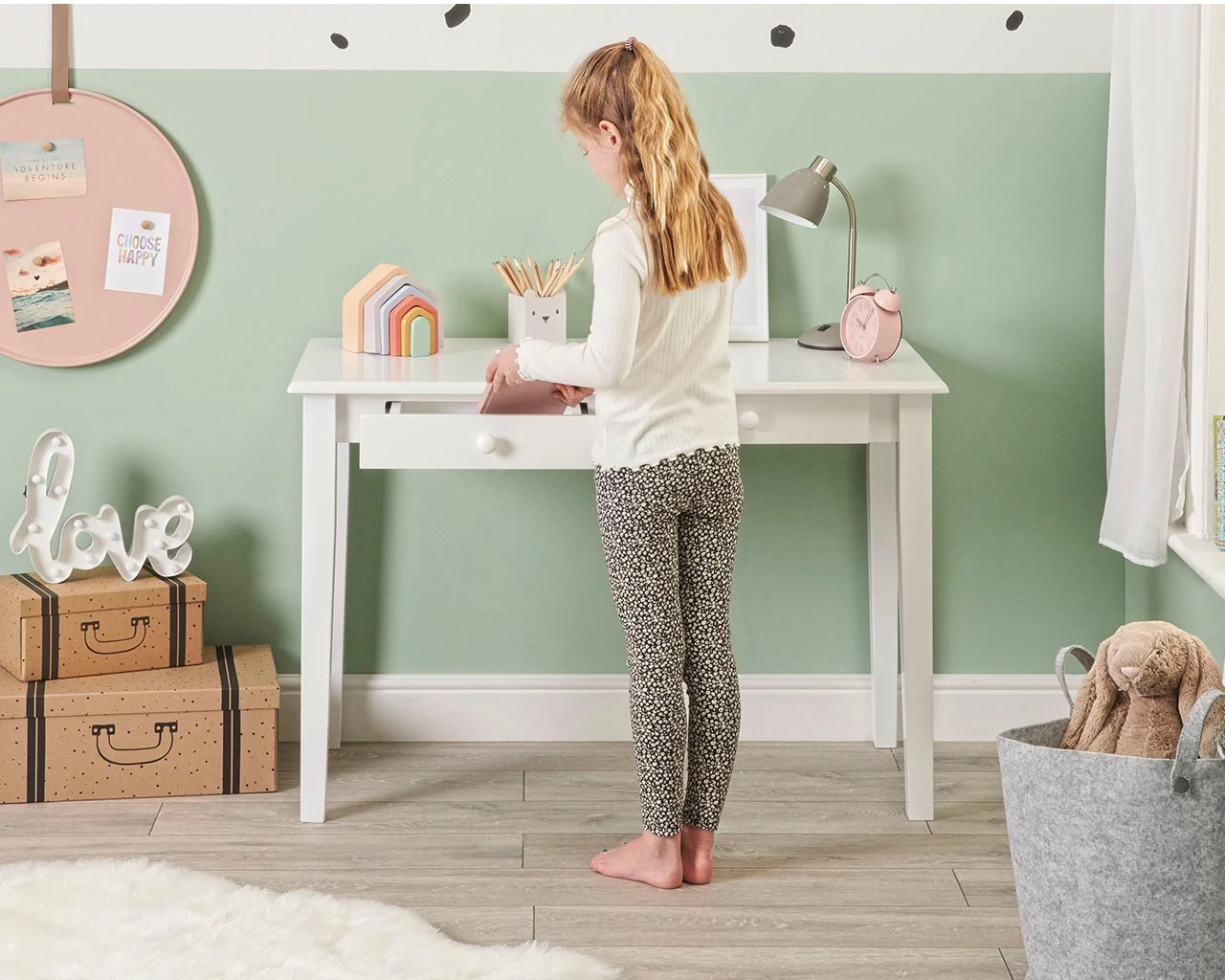 A simple, timeless free standing desk with slim tapered legs and two compact front drawers with rounded handles. The Gala desk will last throughout the years as your child grows. The large work surface gives plenty of space for crafting, drawing, studying or gaming. The two front drawers are handy for keeping stationery and art materials to hand. Available in Grey, White and Black. Model shown is age 8, height 133cm