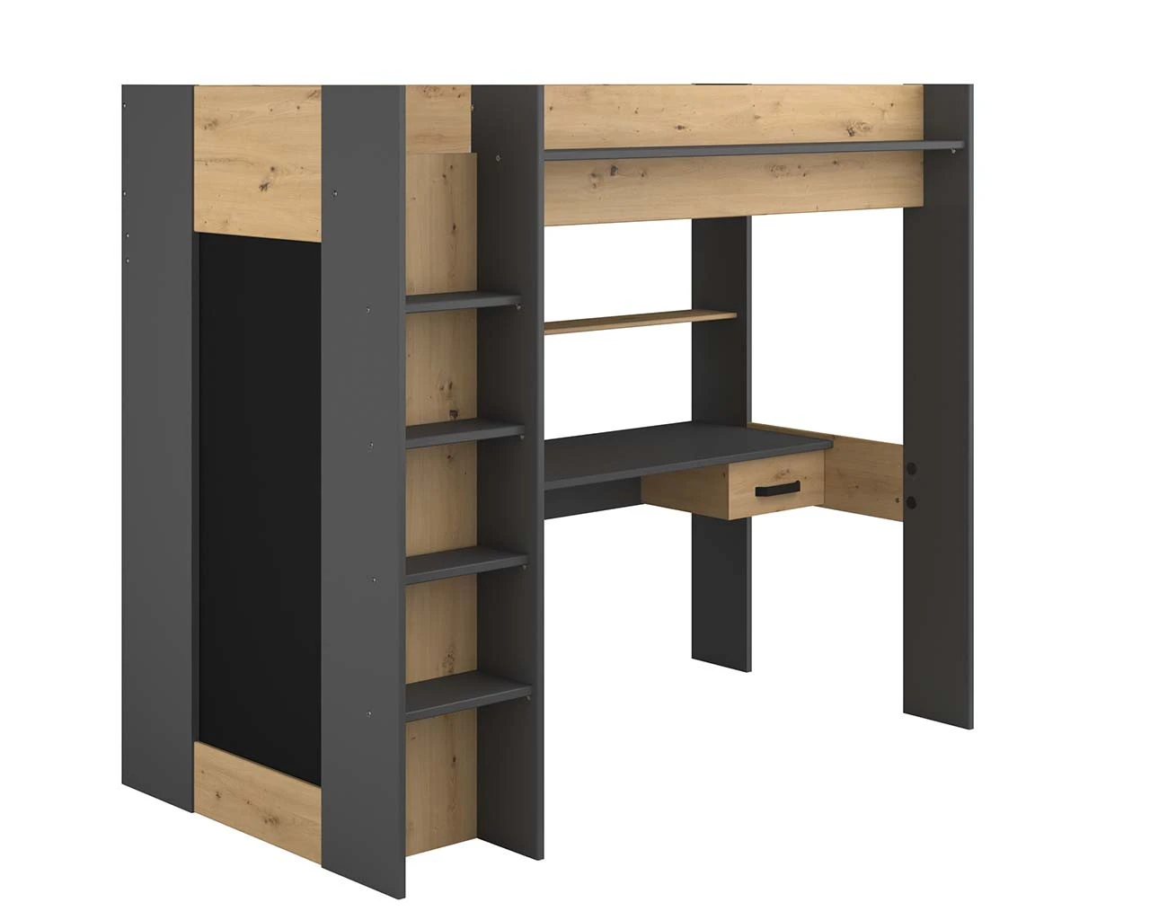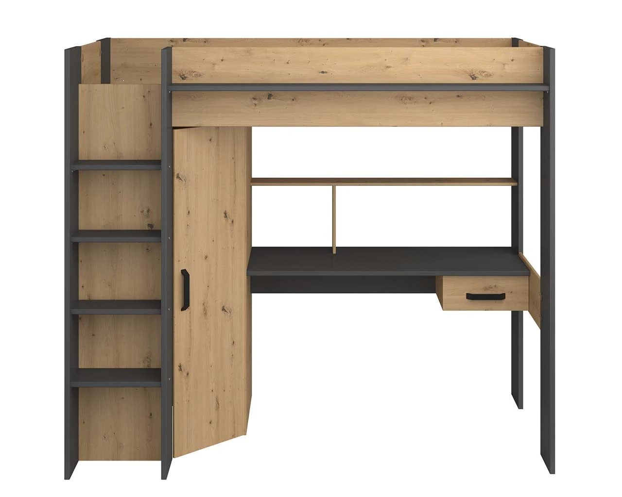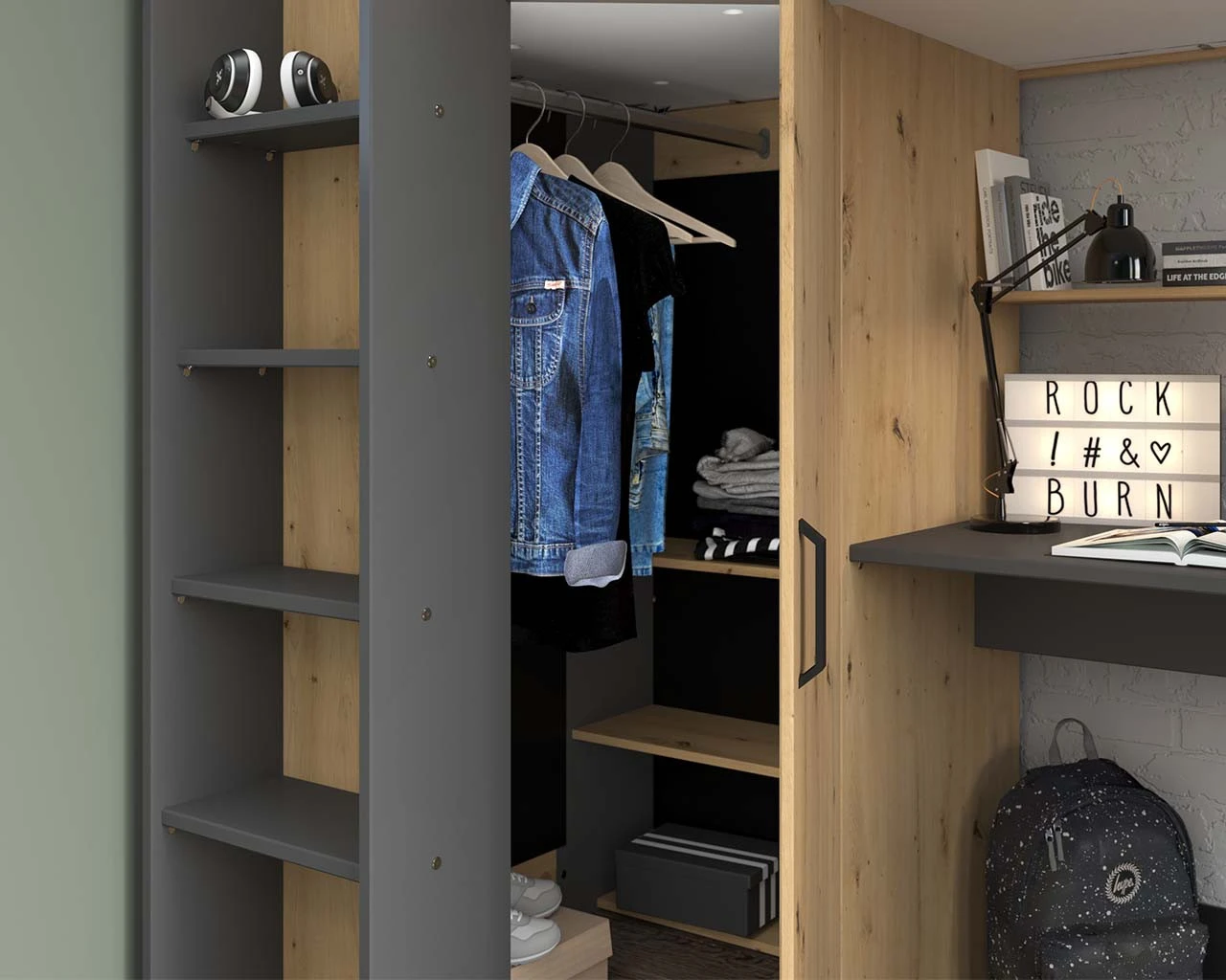 The Grayson highsleeper has everything to offer with a bed, wardrobe, desk and handy storage space all in the footprint of a 90×200 space. The generous desk provides the perfect place to study, read, game or get creative! The raised shelf provides extra handy space and a built in drawer will come in use for keeping things safe. Available in a beautiful deep charcoal and oak effect finish for a contemporary style. An underneath wardrobe with rail is perfect for storing clothes away with further shelf space for more helpful storage at the back of the wardrobe. Deep treads on the ladder provide easy climbing and an added shelf at the top is great for keeping belongings within easy reach during sleep hours.