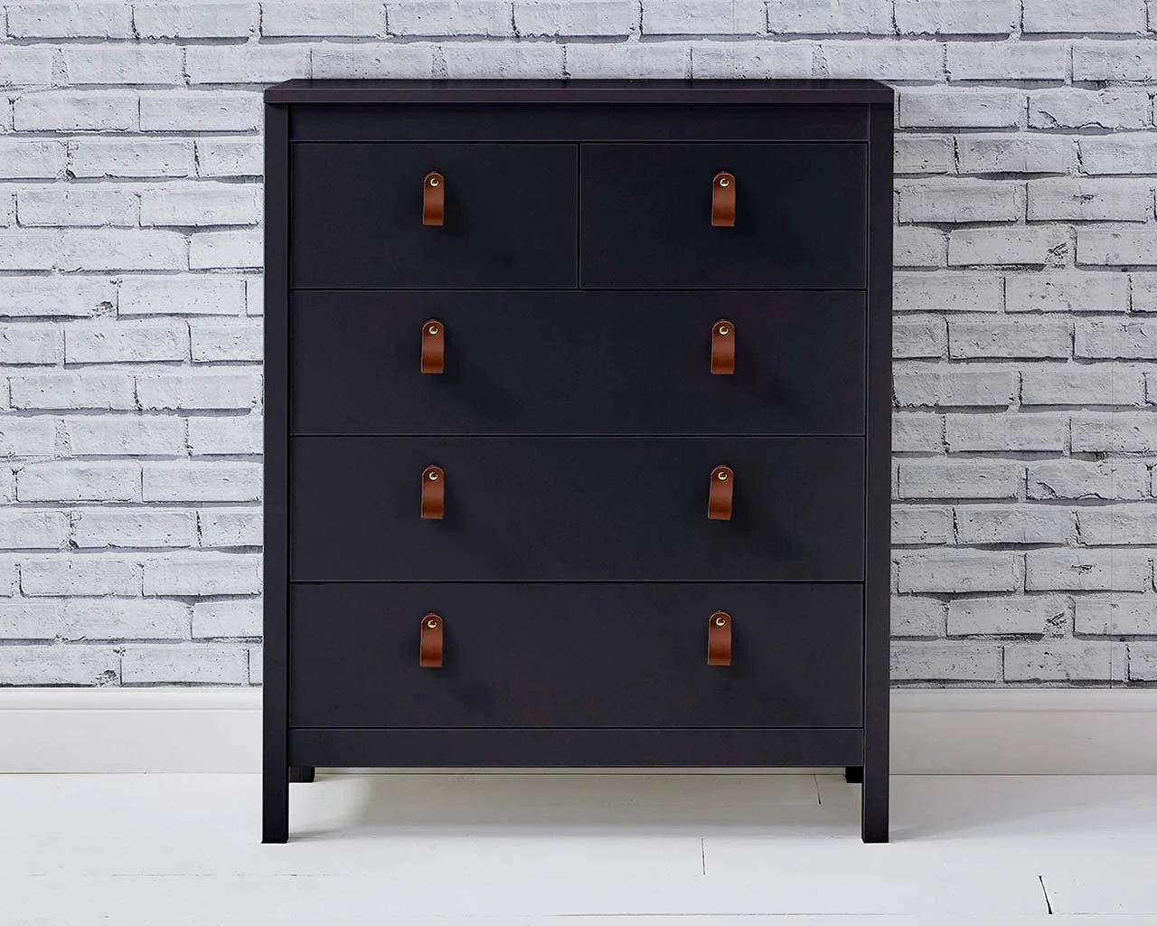 Featuring five drawers, two smaller sized up top and 3 standard central drawers below, the the Loop 5 drawer chest is ideal for keeping organised and mess free. Modern and Minimal in design, the Loop collection comes with stylish pull tab handles for that extra finishing touch. In a Tan Faux leather material, the warm contrast of these handles adds a nice natural finish to the collection. The Loop collection is available in White and Black with more items in the collection to chose from. Model shown is age 9, height 137cm