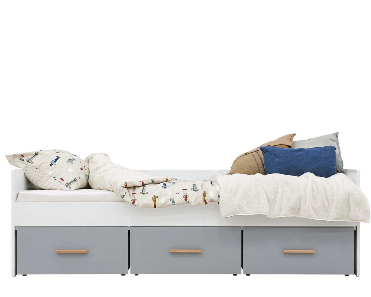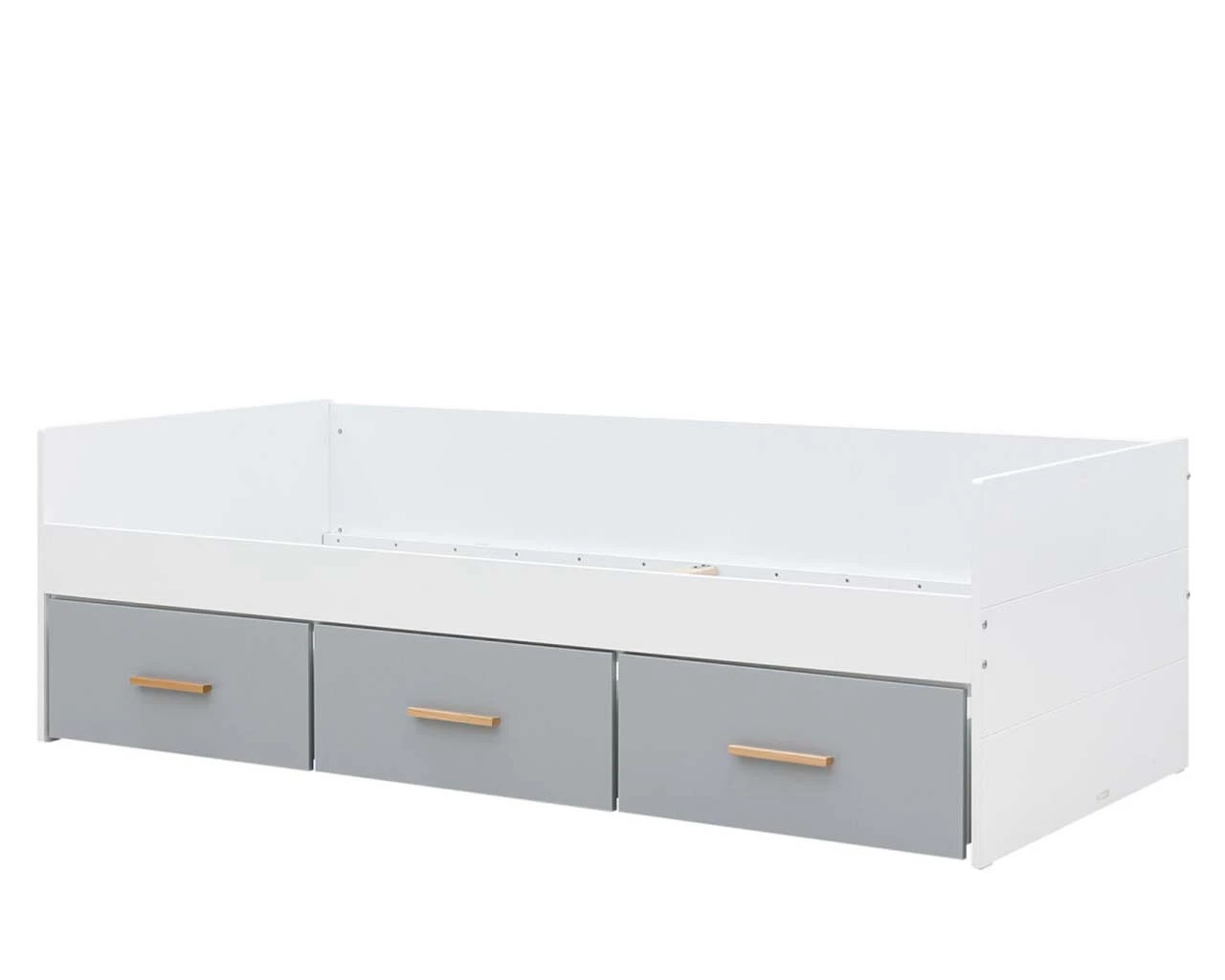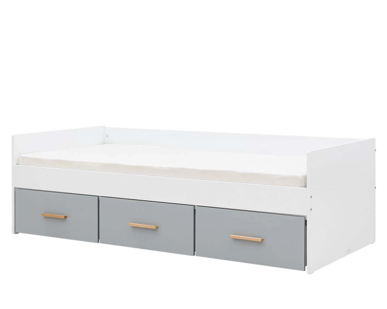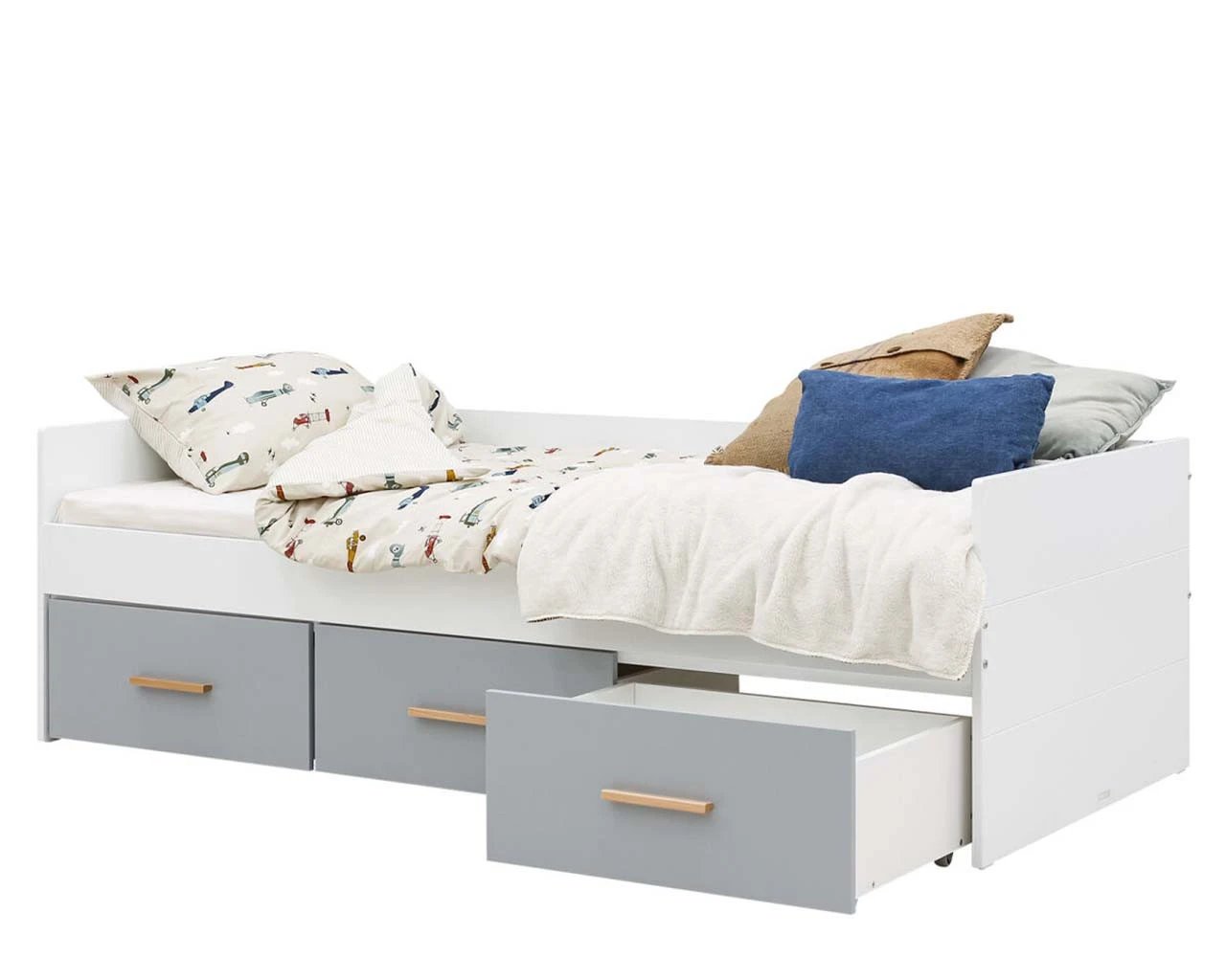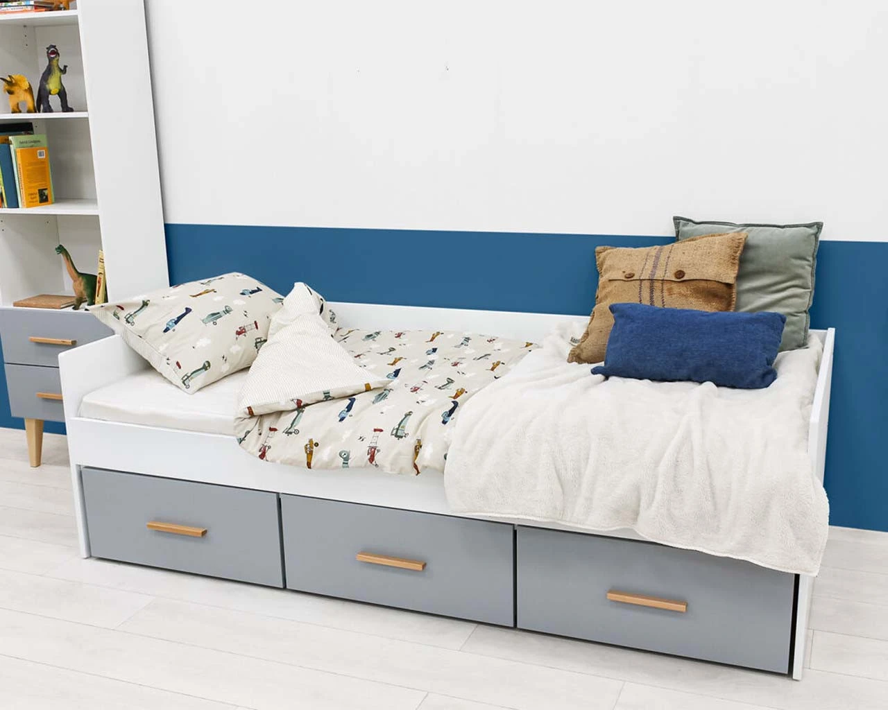 The Malin single storage bed offer bundles of storage space whilst offering a cool and contemporary design. It’s crisp white base contrasts against the grey drawer fronts and stunning wooden handles lend a natural and warm finish. Three storage drawers are placed neatly underneath the bed frame and offer the perfect solution for keeping games and toys or clothes and accessories tidied neatly away and out of sight. The easy glide castors on the bottom of the drawers make the storage a simple to use and fuss free option for little ones.