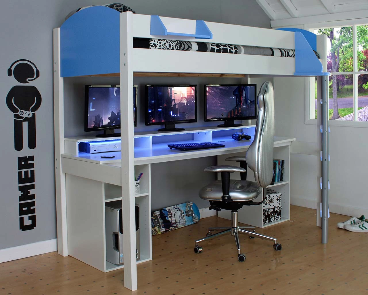 Our popular Noah High Sleeper is now available as it’s very own gaming station. The ultimate sleep and gaming combination with a choice of head and footboards in white, lilac or blue with matching ladder steps. The long desk is ideal to host 3 screens and the under desk units easily hold a tower unit. Included with this gaming bed are a remote controlled LED light strip and a wireless charger with USB which can be fitted into the desk top. The perfect bed for a gaming enthusiast!