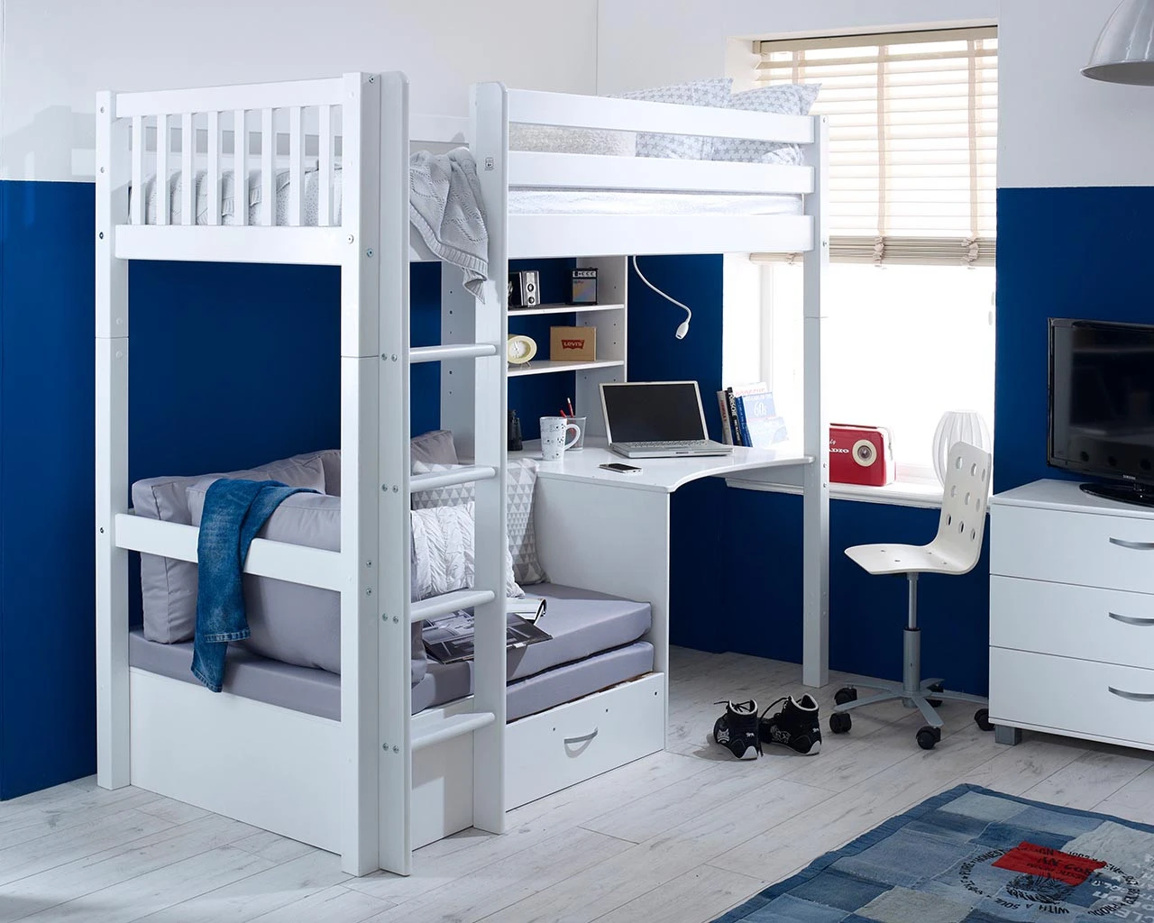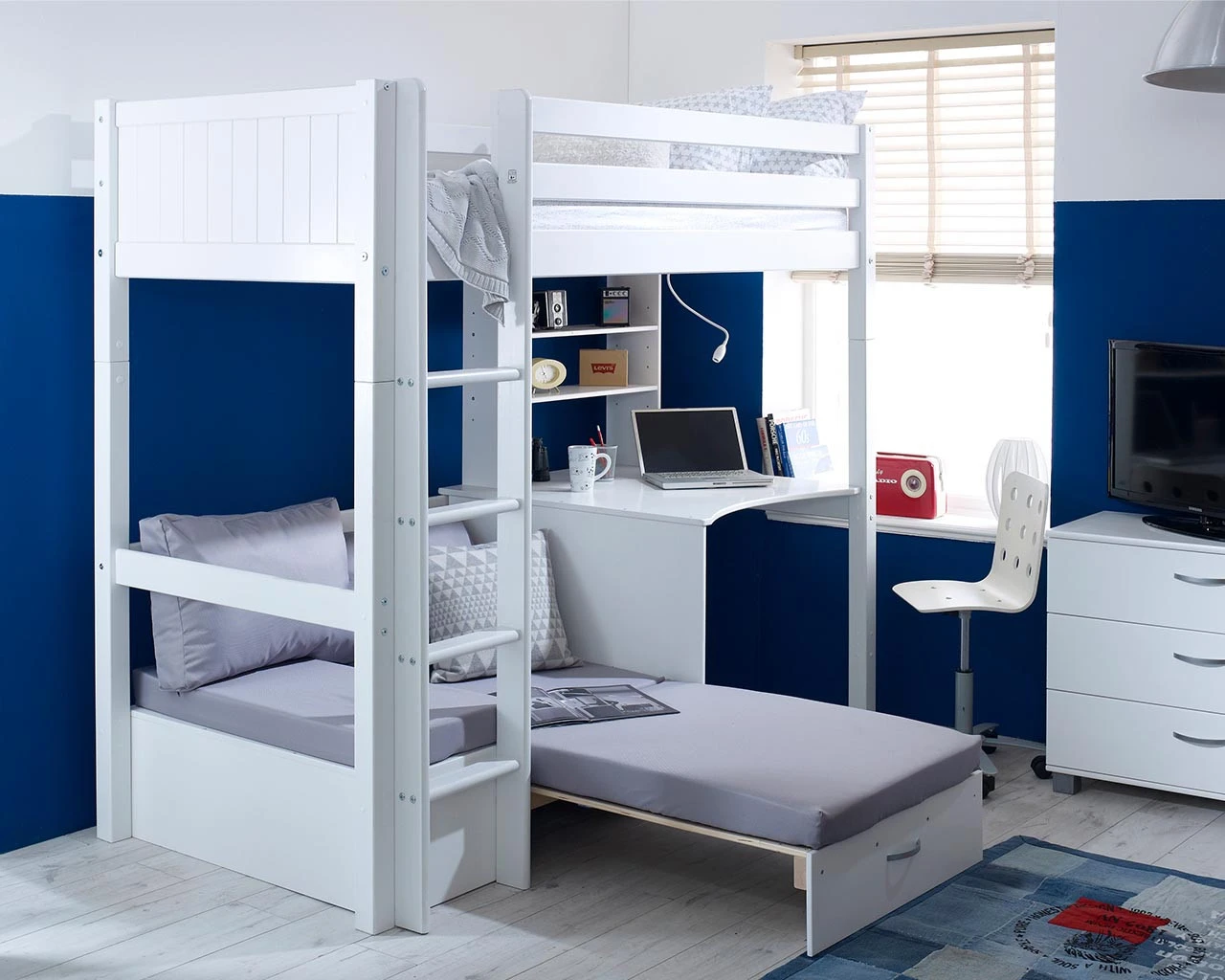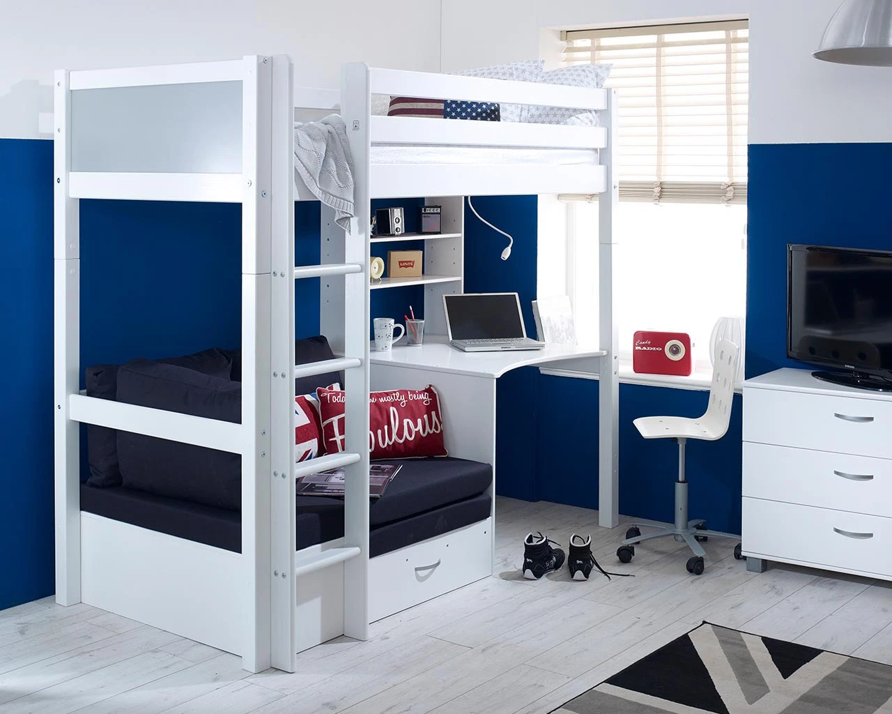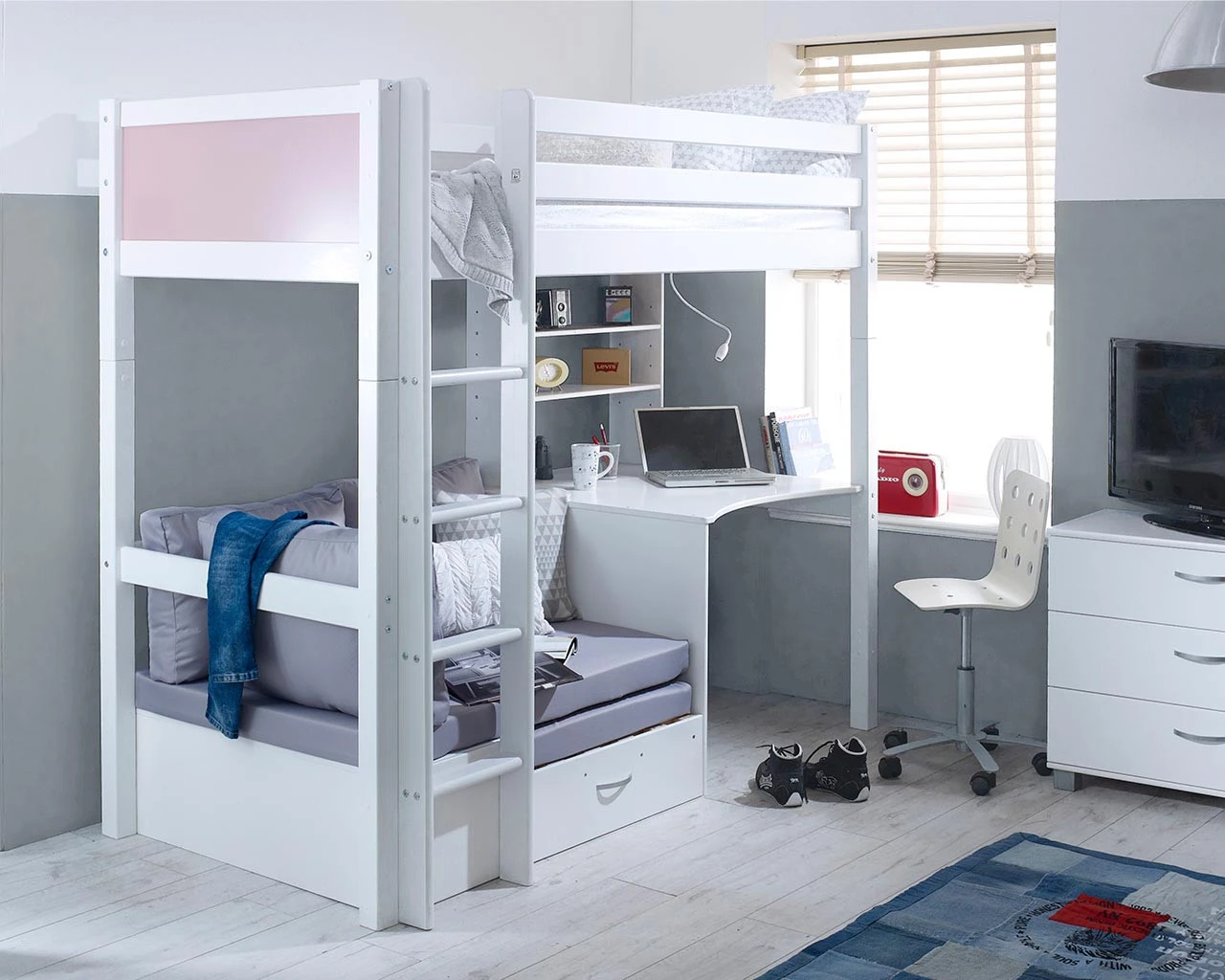 The ultimate space saving high sleeper. A contemporary white wooden high bed with the choice of colour end panels (White, Grey or Pink) to suit your bedroom decor. With a neat desk and shelving unit for study and storage plus a sofa chair bed for relaxing, this bed has everything any child would love in their bedroom. The sofa chair comes in 3 bold colours (black, red or grey) to choose from and the futon easily pulls out to convert into a guest bed, particularly handy for sleepovers. Manufactured from a solid and robust Scandinavian pine and fully reversible so the ladder can be built to the left or right.Â