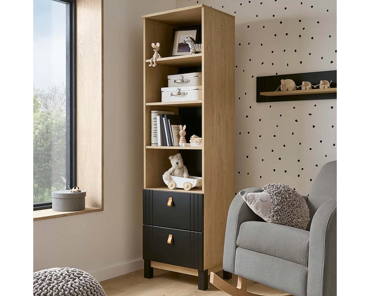 This practical and slim unit fit perfectly into corners and smaller spaces to provide you with storage for your nursery, use the multiple storage shelves to either display your treasured items or to store boxes away within easy reach. The two deep set drawers provide more storage space for items to be kept neatly stored away and out of sight.Â