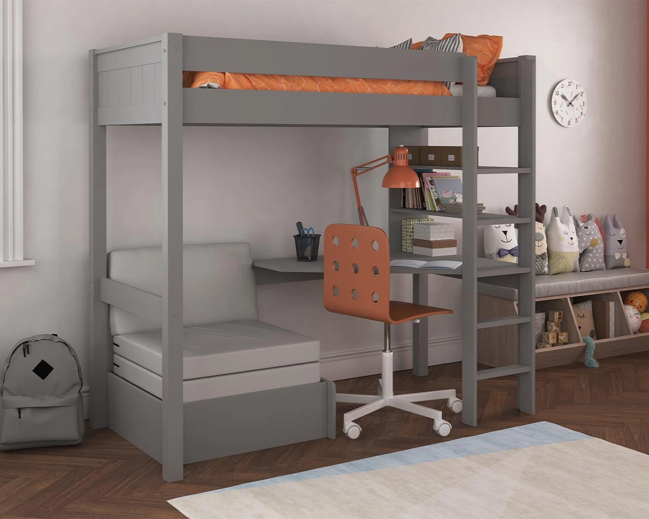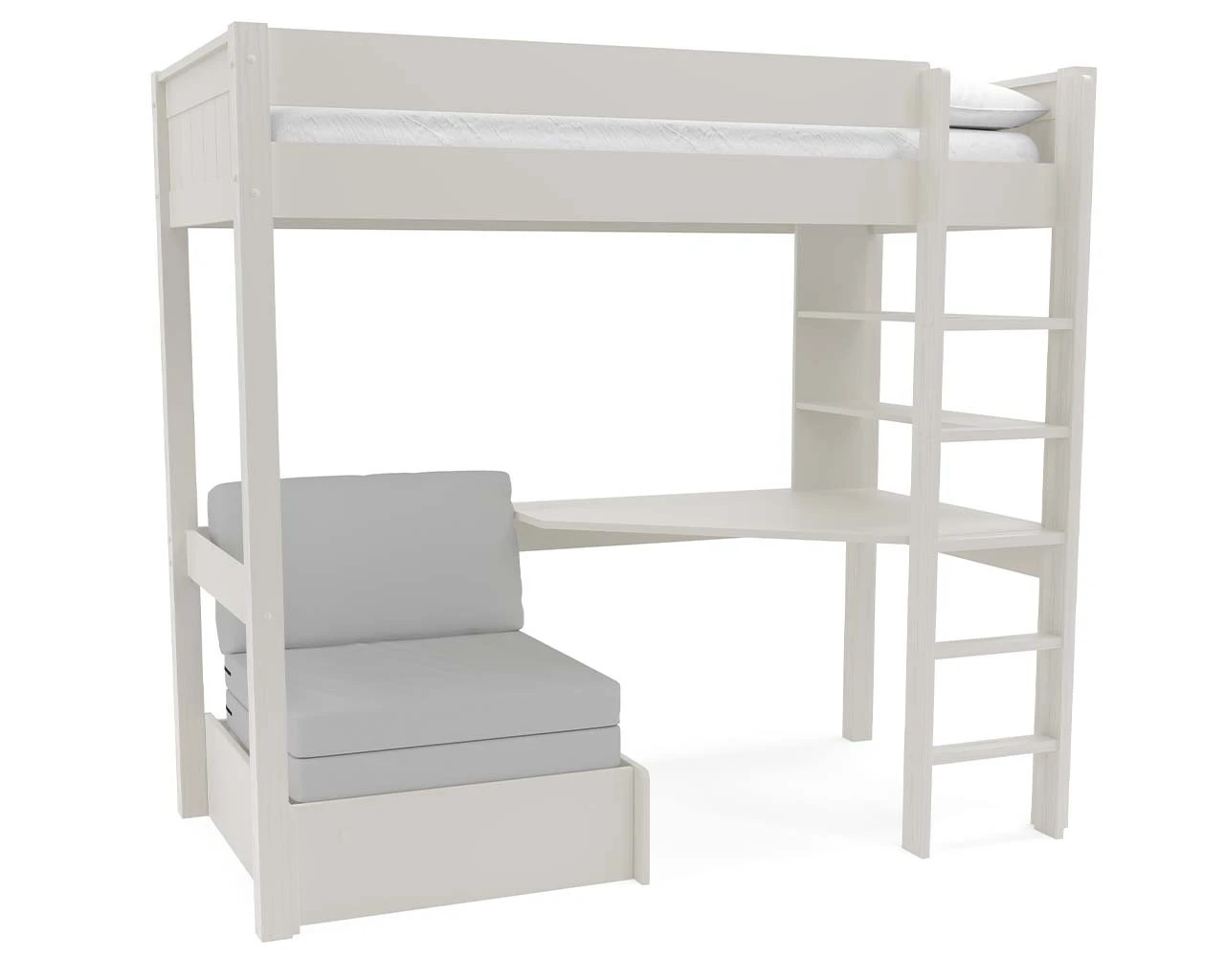 This Stompa Classic Kids Wooden Highsleeper Bed with Chair bed is a great multifunctional space saving option. The raised bed allows for plenty of space and movement underneath to use the fully integrated desk and the chair bed. Perfect for sleepovers and guests, the chair bed extends outwards from a chair to a bed for occasional use. Available in a beautiful warm white or soft grey finish with premium tongue and groove detailing, offering a classic touch on the head and foot boards.