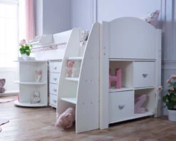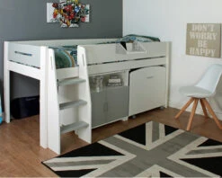 The Classic Kids Wooden Midsleeper Bed is another hit bed from Childrens furniture brand Stompa. Choose from a warm white or soft grey finish with premium tongue and groove detailing on the headboard and footboard. With lots of open space for your own storage solutions or for creating a play area, the desk also offers an area for study or play and can be rolled away underneath when out of use. The ladder can be fixed on the the left or right hand side to suit your room layout. A great bed for space saving.