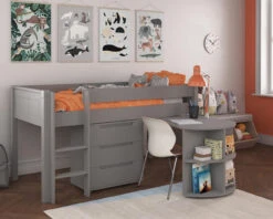 What more could you want from a highsleeper. With it’s sofa bed, cupboard and fixed bookcase with pull down desk this bed will not only look great but have everything your child requires. It’s the perfect sleep, study, gaming and storage solution. Finished in a warm white and birch detailing on the ladder, bed ends and desk unit. Manufactured from a solid Pine, birch and MDF this bed not only looks fab it will last throughout the years to come.