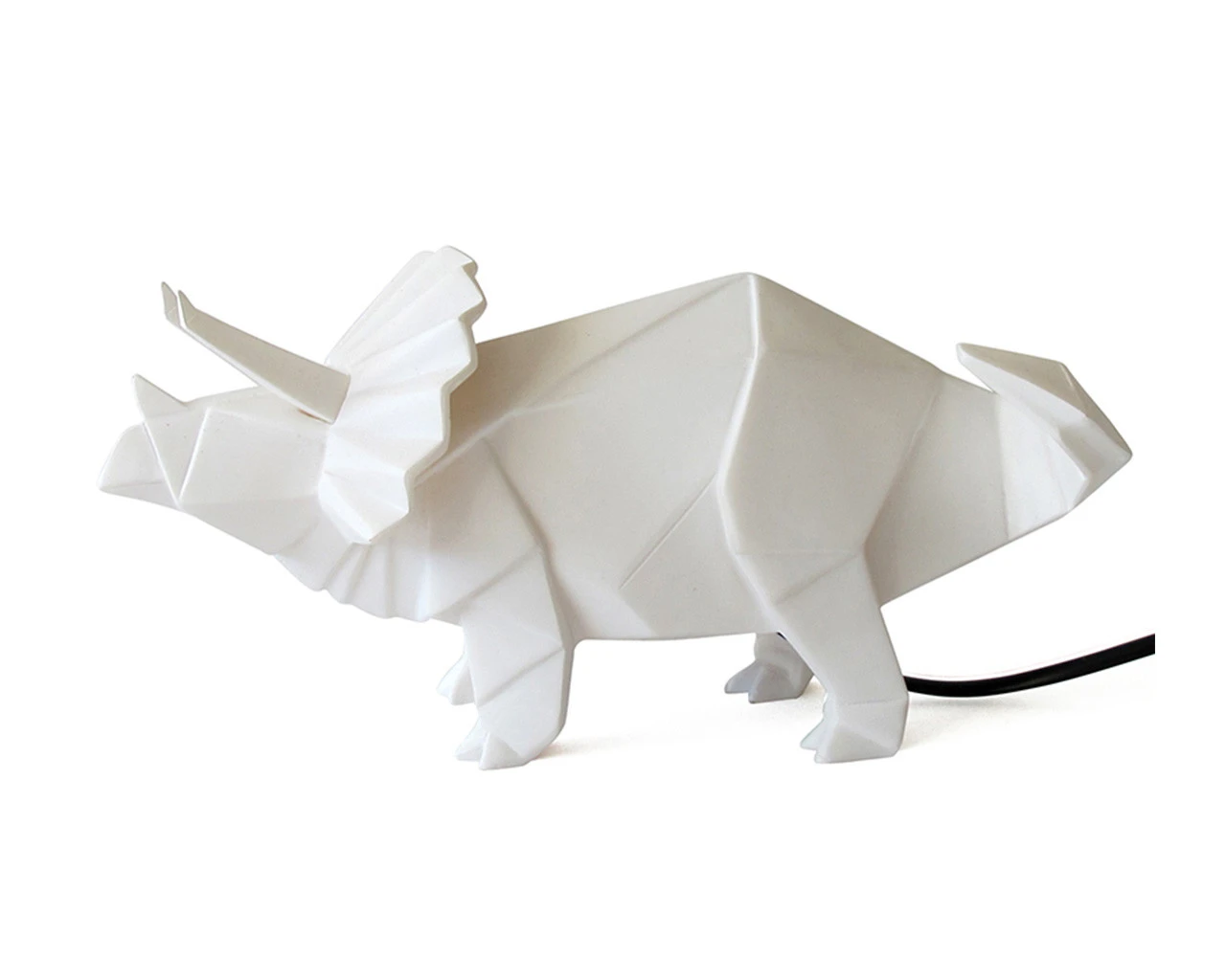 An origami style white Triceratops light adds a fun touch to any bedroom. With it’s warm glow it is the perfect bedside companion. A great gift for any dinosaur enthusiast and a style statement too! Safe LED light with black cable and switch.